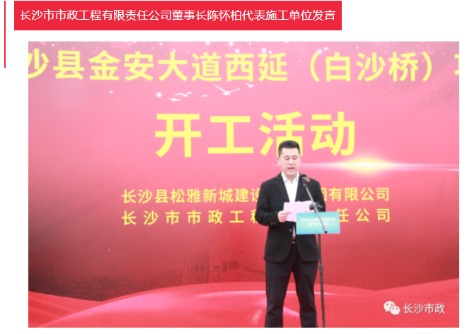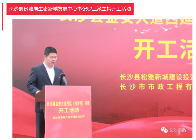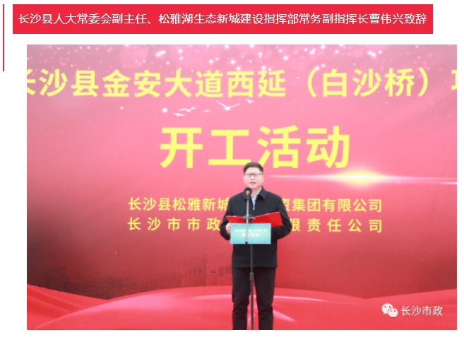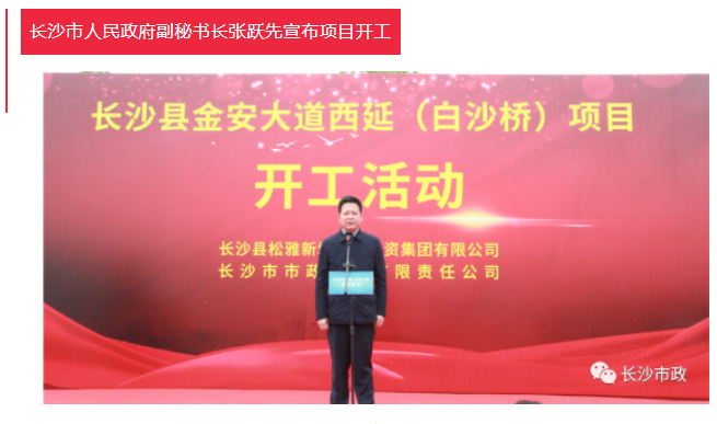 4月19日上午,長沙縣金安大道(含白沙河橋)西延項目開工活動隆重舉行。長沙市人民政府副秘書長張躍先,長沙縣委副書記、縣長、松雅湖生態(tài)新城建設(shè)指揮部指揮長陳永高,松雅湖生態(tài)新城建設(shè)指揮部常務(wù)副指揮長曹偉興,長沙市市政工程有限責(zé)任公司董事長陳懷柏出席活動。長沙縣松雅湖生態(tài)新城發(fā)展中心書記羅衛(wèi)滋主持開工活動。